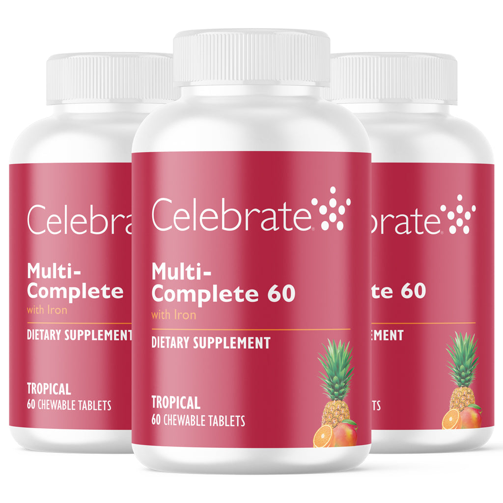 Celebrate Multi-Complete 60 conține toate vitaminele și mineralele într-o opțiune cu doză divizată de două pe zi, pacienții trebuie doar să adauge calciu. Acest multivitamin are cel mai mare conținut de fier dintre toate multivitaminele bariatrice de pe piață, făcându-l perfect pentru pacientul care a avut o procedură de anastomoză unică și necesită mai mult fier. Acest multivitamin bariatric îndeplinește standardele ASMBS de multivitamine și fier după operația bariatrică și include, de asemenea, un nivel mai ridicat de vitamina B-12 (1000 mcg). Această formulă integrată oferă biodisponibilitate maximă, deoarece am selectat cu atenție fiecare formă de vitamină și mineral pentru a îmbunătăți interacțiunea și absorbția. MC-60 este disponibil în formă masticabilă (aromă Tropical) sau în capsule.